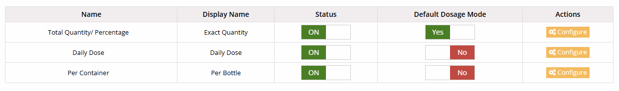 Each Formula Builder supports three dosage modes. At least one dosage mode must be enabled, though you may enable all three if desired.