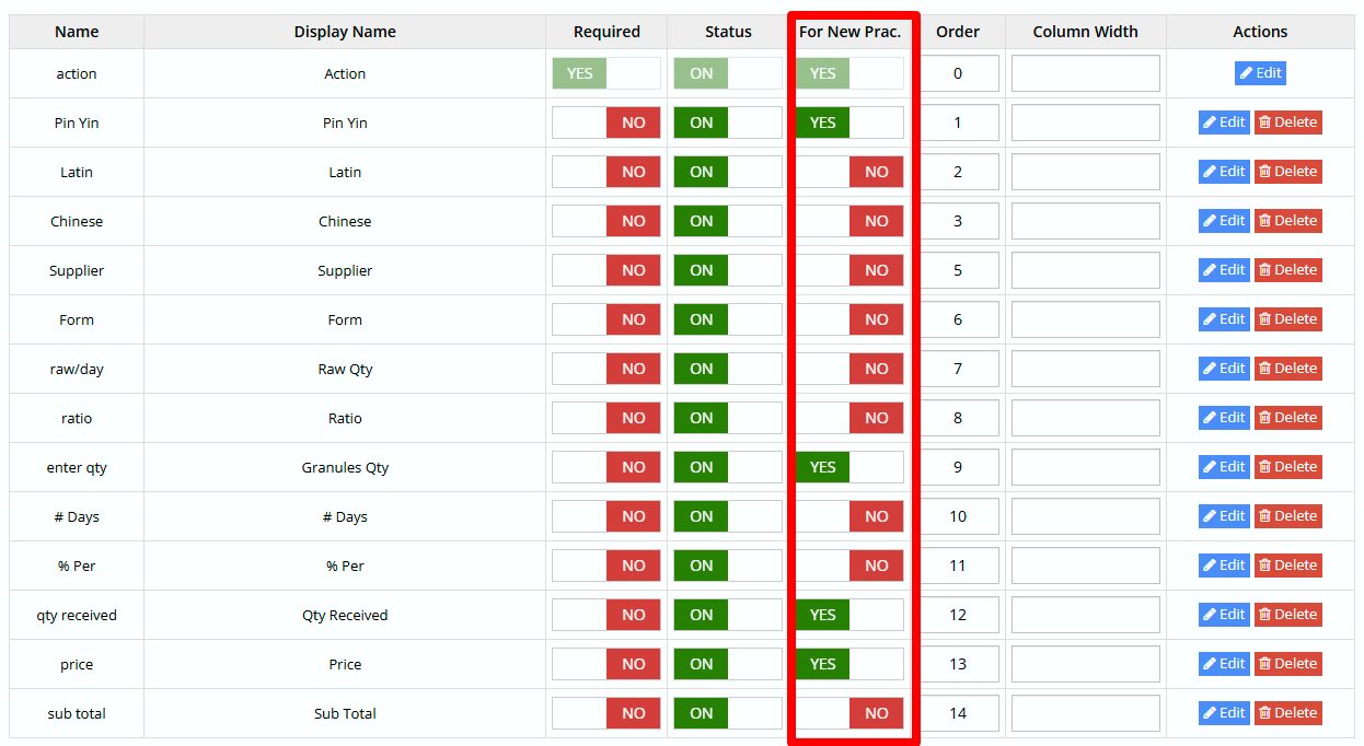 Practitioners can later customize their own column settings by turning columns ON or OFF and reordering them, but the configuration defined in Column Options determines the starting layout for all new practitioners.