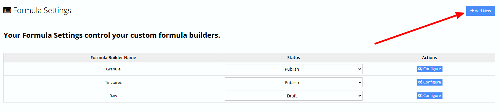 In the top-right corner of the Formula Settings page, click the blue Add New button to begin creating a new formula builder.