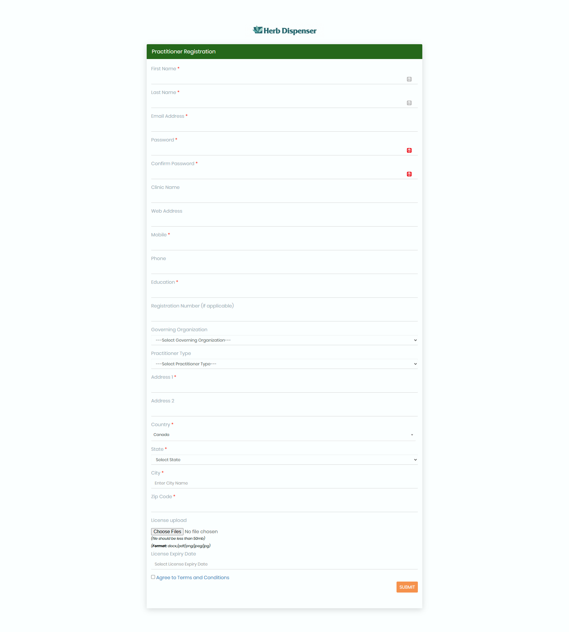 Practitioner Registration Form Settings The practitioner registration form allows practitioners to apply for an account directly through your dispensary website. As the dispensary admin, you have full control over the form fields, approval process, ...