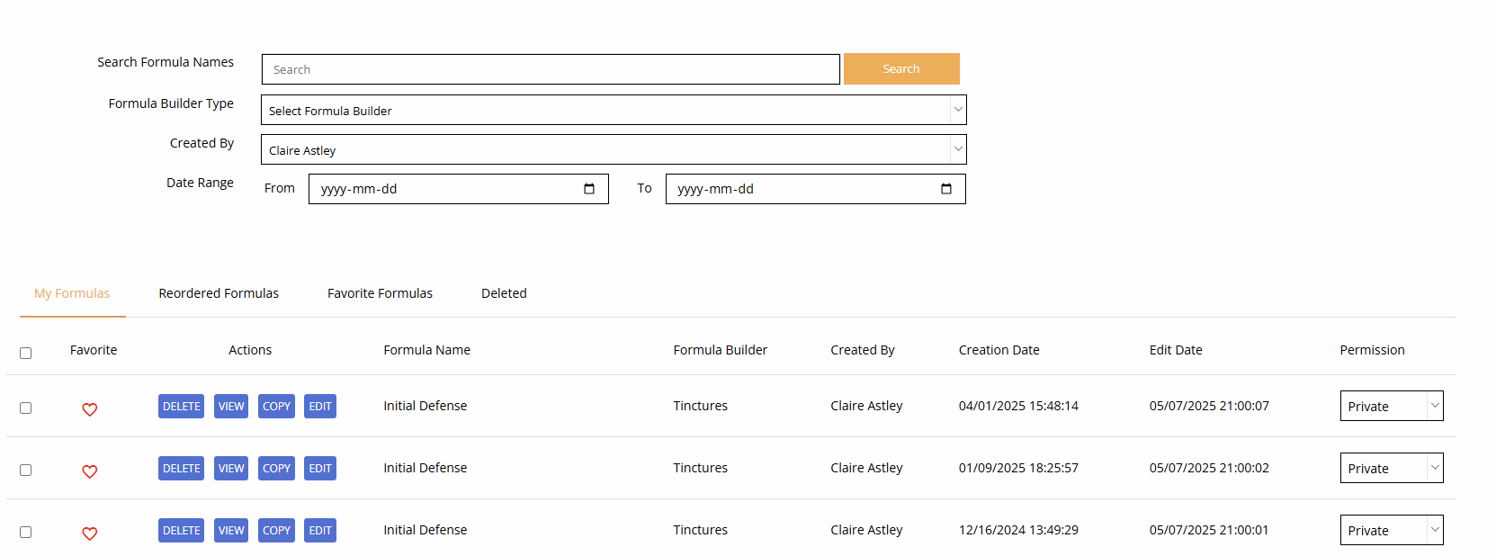 The Formulas Dashboard provides a complete, practitioner-specific history of formulas created within the dispensary.