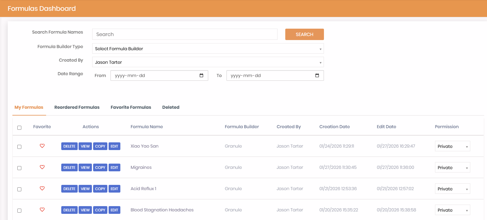 The Formulas Dashboard provides a complete, practitioner-specific history of formulas created within the dispensary.