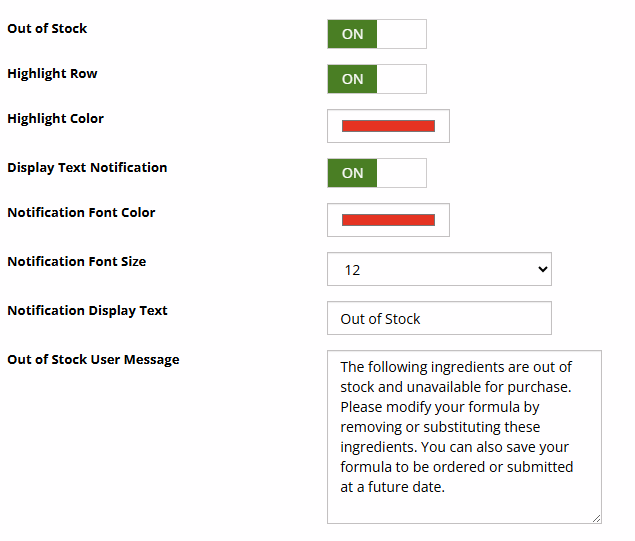 Out of Stock Settings control how ingredients that are unavailable are displayed to practitioners while building a custom formula. These options allow you to clearly communicate stock issues and guide users on what actions to take.