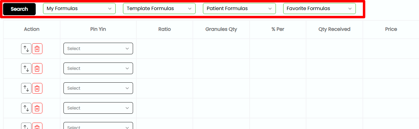 Ingredient Tabs (also referred to as ingredient dropdowns) appear above the ingredient section in the Formula Builder. They help practitioners quickly navigate and filter ingredients by common groupings such as Search, My Formulas, Templates, Patient Formulas, or Favorites.