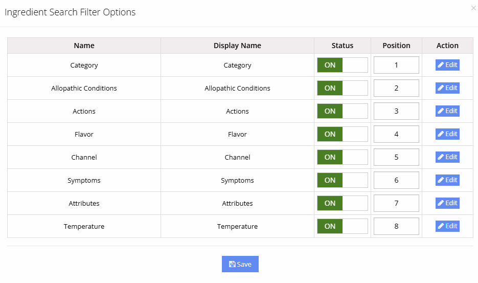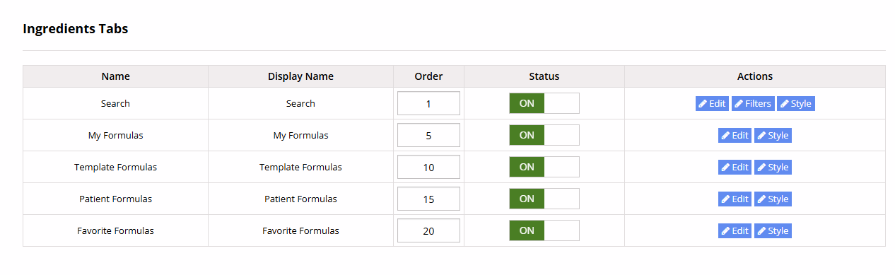 Only filters set to ON will be available to practitioners when searching for ingredients.