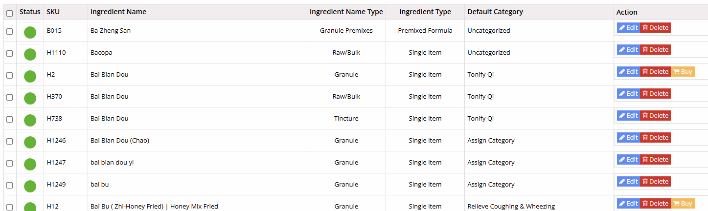 The Ingredient List displays all ingredients in your dispensary and provides a centralized place to manage their status, categories, and settings.